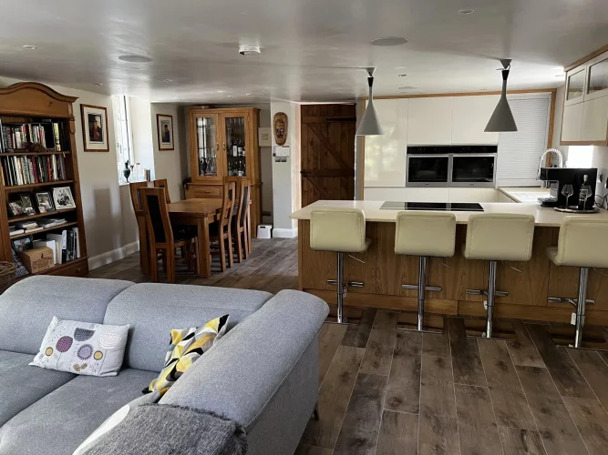 The ground floor living area offers a wonderful open plan living/ kitchen/ dining room with woodburner. The bespoke kitchen has Miele integrated appliances throughout. The lower ground floor, which is accessed via the bespoke spiral staircase offers a large living room, a guest bedroom and shower room, giving any guests complete self-sufficiency. In addition there is a utility /plant room and access to the cellar.