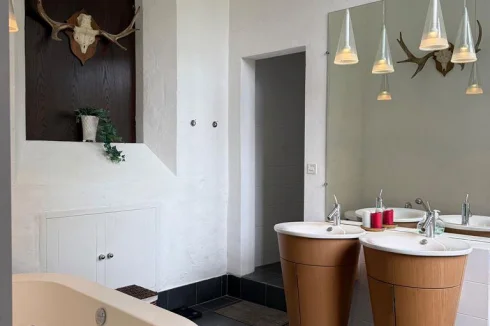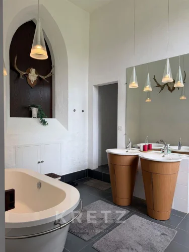 On the outskirts of a village in the Haut Anjou region stands this remarkable château built by a superintendent of finance for the Sun King in the late 17th century, whose classical architecture is matched only by the refinement of its interior decor. The château offers over 800m2 of living space and more than 20 rooms, including superb reception rooms on the ground floor with sumptuous Louis Xv decorations: vestibule d'honneur, grand salon with rocaille gypseries and wood panelling, dining room with fountain and Solesmes marble fireplace, wine cellar, 18th-century kitchen with kitchen garden and 5-meter-high ceiling, grand baluster staircase, salon with fireplace, vaulted hall (former chapel), bathroom, study, summer kitchen. Second floor: apartment comprising kitchen, bedroom, living room with superb wood panelling, bathroom, toilet, large gallery opening onto 8 bedrooms with bathrooms. The entire property was completely renovated (except for some windows) in the 1990s (roofing, plumbing, electricity), with minor refurbishment to be scheduled. A vast outbuilding wing comprising stables (two boxes), marble dairy, bread oven, sheds and a renovated janitor's cottage with two bedrooms, kitchen, living room, closes off the courtyard of honor. Well, rose garden. The whole forms a peaceful estate on over 18ha of land, including lawn with boxwood parterre, meadows, woods and a river forming an island, as well as fine recent equestrian facilities and a tower used as a dovecote.